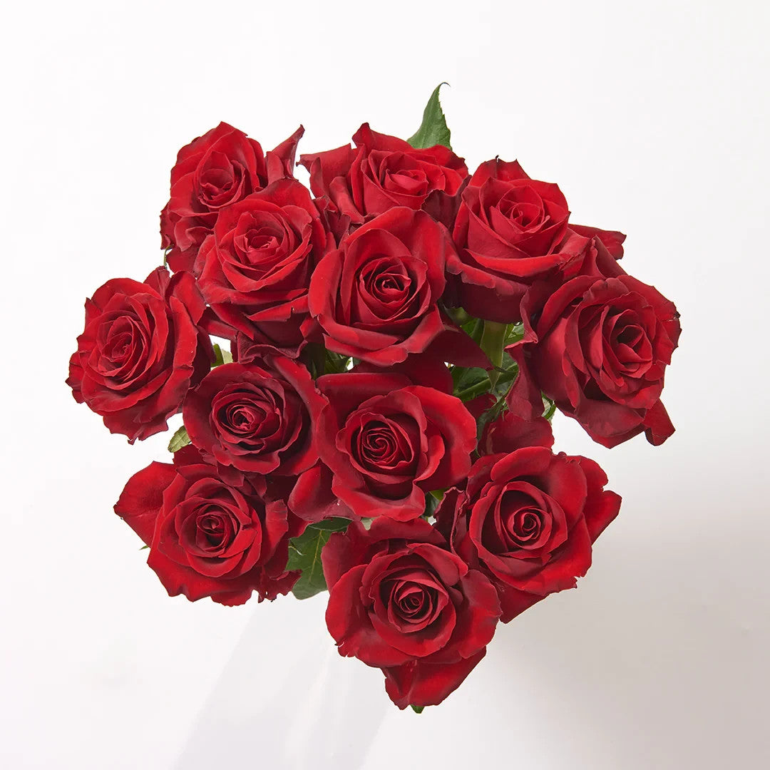The bouquet contains 12 red rose stems prepared to a consistent length suitable for boxed presentation and standard vase placement.